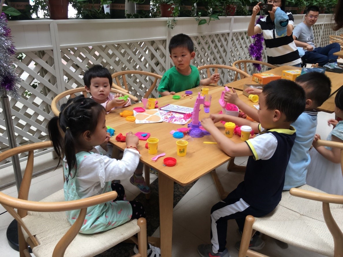 小朋友们围坐在一起,认真捏着手中的橡皮泥,经过自己的一番创造,捏出了造型各异的作品,作品会聚在一起组成了一顿精美丰富的“下午茶”:有披萨、冰淇淋、水果,好不丰盛。还有的小朋友跟着老师一起学画画、学习下跳棋、共同完成拼图,开启头脑风暴。
