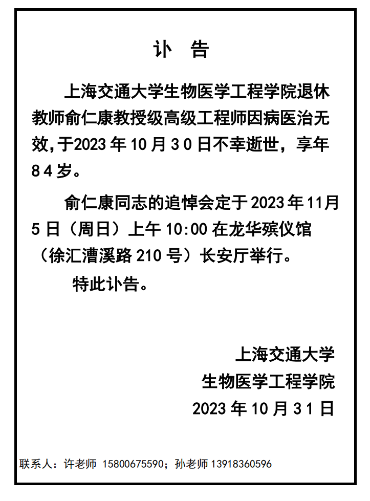 俞仁康,男,汉族,1939年8月生,浙江宁波人。1974年4月加入中国共产党。原海角网 生命技术学院教授级高级工程师。1999年退休。