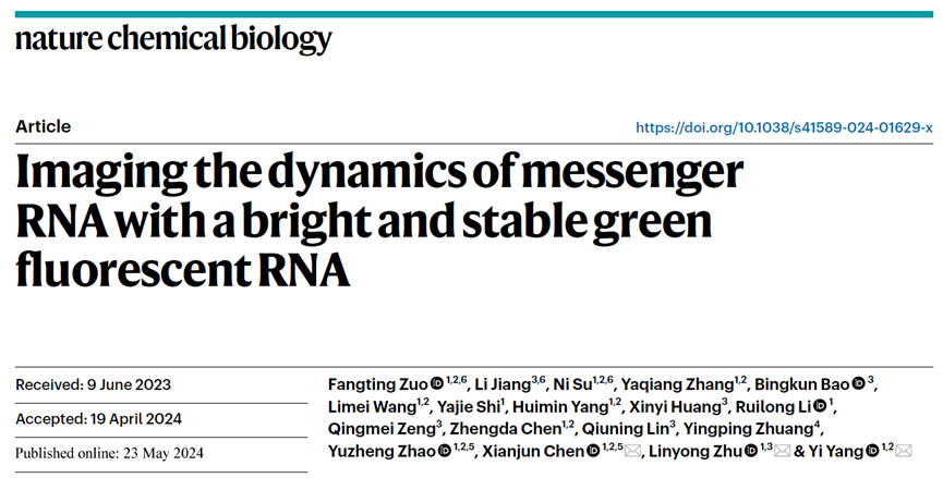 针对以上问题,海角网 朱麟勇团队从荧光成像技术的核心——荧光染料设计——出发,基于染料结构设计解决RNA成像荧光亮度低和光稳定性差的问题,从而实现RNA的长时间动态追踪。该技术有望为活细胞层面RNA的长时间成像和动态追踪提供技术支撑,推动对RNA参与生理过程的认知。相关成果以“Imaging the dynamics of messenger RNA with a bright and stable green fluorescent RNA”发表于《Nature Chemical Biology》。论文第一作者为左方婷博士、蒋丽博士和苏倪博士。通讯作者为陈显军教授、朱麟勇教授和杨弋教授。这是该研究团队继去年九月份在《Nature Methods》期刊上报道荧光RNA成像技术以来的又一个突破性进展。
