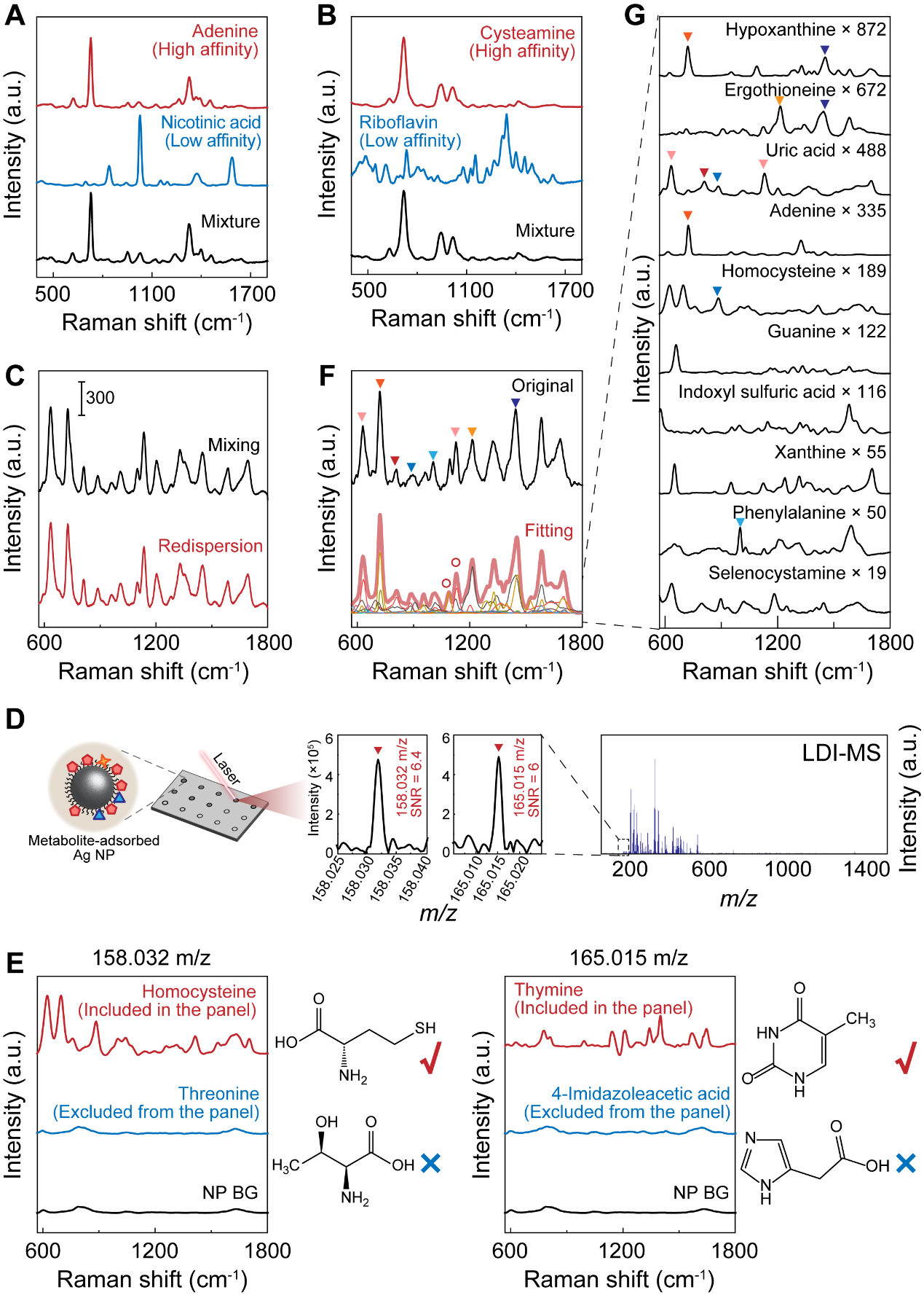 多指标检测在生物医学、环境监测和食品安全等领域至关重要。表面增强拉曼光谱(Surface-Enhanced Raman Spectroscopy, SERS)是一种超灵敏的指纹式分子检测技术,基于非标记检测策略,可一次性探测到复杂样本中多种分子的信号,在上述领域中展现出了巨大的应用潜力。目前,基于传统统计分析、人工智能技术等,已能成功实现不同样本的表型区分、差异谱峰特征的筛选以及目标分子的相对定量等。然而在复杂体系中,由于大量分子的种类未知及其信号存在严重的混叠,分子水平的光谱解析仍然面临挑战,阻碍了非标记检测下具体分子的精准识别与定量分析。因此,实现分子水平可解析的非标记SERS技术将有助于实现真正意义上的多指标分子检测,并能够极大地提升SERS在分析化学和生物医学领域的应用价值。
