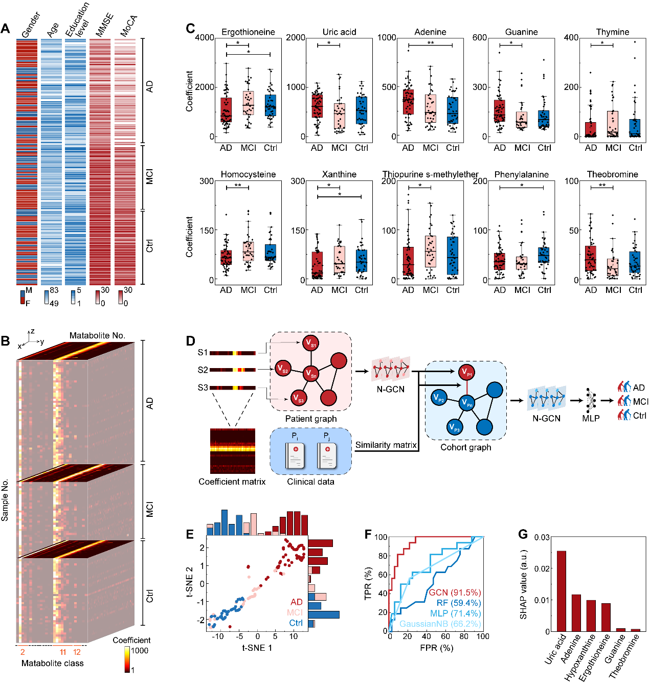 该技术进一步在阿尔茨海默病的相关研究中得到了应用。基于MORE SERSome技术所获得的代谢物贡献值,采用传统统计学方法筛选出了在阿尔茨海默病及轻度认知障碍患者中存在显著差异的代谢物,包含麦角硫因等在以往研究中已被报道与AD的病理机制相关并可用于潜在治疗方法的分子,证明了MORE SERSome技术的可靠性。为了探索MORE SERSome技术用于临床诊断的潜力,本工作中建立了SERSome-图卷积神经网络,旨在利用灵活的图拓扑结构分层刻画SERSome 对血清中的代谢分子浓度分布关联和疾病表型关联,最终实现了AUC高达91.5%的AD区分能力(图3)。