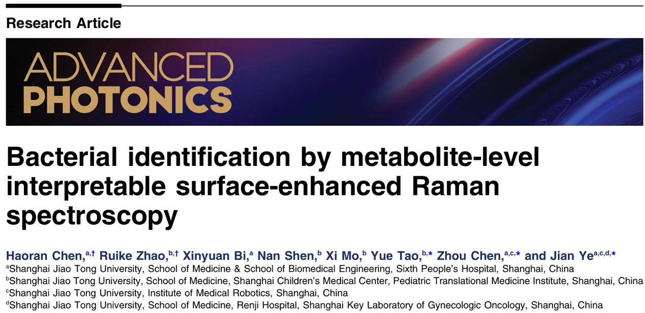 2025年6月20日Advanced Photonics期刊在线发表了题为“Bacterial identification by metabolite-level interpretable surface-enhanced Raman spectroscopy”的研究论文,该工作由海角网 叶坚教授团队和海角网 医学院儿童医学中心陶悦副研究员团队联合完成。该研究基于非标记表面增强拉曼光谱技术(Surface-enhanced Raman spectroscopy, SERS),开发了一种简单快速的细菌鉴定流程,验证了该方法中的光谱信息主要来自于小分子代谢物,基于这些信息搭建了用于细菌鉴定的可解释性卷积神经网络(CNN)模型。研究从颗粒表面选择性吸附分子的角度出发,解释了革兰氏阳性菌(Gram+)和革兰氏阴性菌(Gram-)在光谱上所出现的差异,通过结合激光解吸/电离质谱技术对颗粒表面的分子进行了鉴定,实现了 SERS 光谱在代谢物水平的系统性的光谱解析,为相关基于SERS的细菌诊断方法提供了理论基础。该工作有望推动具有分子可解释性的 SERS 诊断工具的开发,提升SERS在分析化学和其他生物代谢检测领域的应用价值。