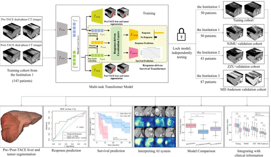 2025年7月10日,国际期刊IEEE Transactions on Image Processing (TIP)在线发表了题为“RECISTSurv: Hybrid Multi-Task Transformer for Hepatocellular Carcinoma Response and Survival Evaluation”的研究论文。该期刊是计算机视觉与医学图像分析领域的顶级期刊,专注于图像处理算法的前沿研究及其在医疗、工业等领域的应用。针对肝细胞癌经动脉化疗栓塞(TACE)治疗后预后存在高度异质性的临床难题,海角网 研究团队联合上海人工智能实验室、南京医科大学提出RECISTSurv模型,一种基于纵向CT影像的混合多任务Transformer框架。RECISTSurv实现肝脏/肿瘤分割、短期疗效反应预测、长期生存评估的多任务协同学习,并通过反应驱动协同注意力机制(RCA)动态关联治疗前后的影像特征,克服传统单时间点分析的局限性,引导模型聚焦预后关键区域,提升可解释性。RECISTSurv在多中心验证中展现出卓越的泛化能力,生存预测性能显著优于现有方法,且风险评分被证实为独立预后因子。