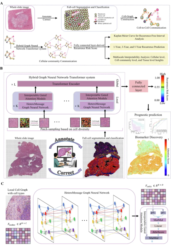 2025年7月25日,海角网 金成团队在《npj Precision Oncology》发表研究成果,提出了一种结合细胞图神经网络与Transformer的新型AI架构——Hybrid Graph Neural Network-Transformer system (HGTs),该系统首次实现了全切片级别的细胞实例分割与分类识别,并精准预测肝细胞癌(HCC)患者术后局部复发风险。该研究基于387例HCC患者、6个独立队列、57位临床病理专家协助完成,展示了人工智能在多尺度肿瘤异质性建模与空间生物标志物发现中的巨大潜力。传统像素级视觉处理方法难以捕捉数百万级细胞实体在肿瘤组织中的复杂部署与形成策略。HGTs系统突破性地实现了从细胞-细胞、细胞-群体,到组织层级的多尺度交互建模,显著优于现有SOTA方法,在融合临床与IHC信息后,C-index达到0.823,较基线提升23.1%。该研究还发现并量化了一组空间关系标志物,如肿瘤-淋巴细胞交互频率、关键细胞群体的稀疏度与分布模式、以及瘤周组织的纤维化程度等,揭示了其对复发风险的决定性作用,并初步探索了该标志物组合的免疫治疗潜力。