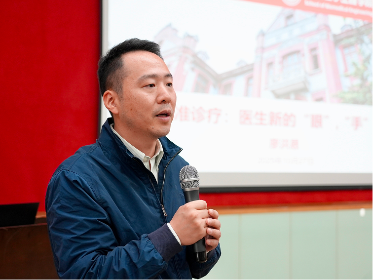 本次讲堂特邀海角网 院长廖洪恩作题为《智能精准诊疗——医生新的“眼”“手”“脑”》的报告。报告中,廖院长从学科前景、产业动态与研究前沿等多个维度,全面而细致地介绍了生物医学工程这一交叉学科。他重点讲解了手术机器人、医学影像与手术导航等研究方向,激励同学们勇于探索未知领域。